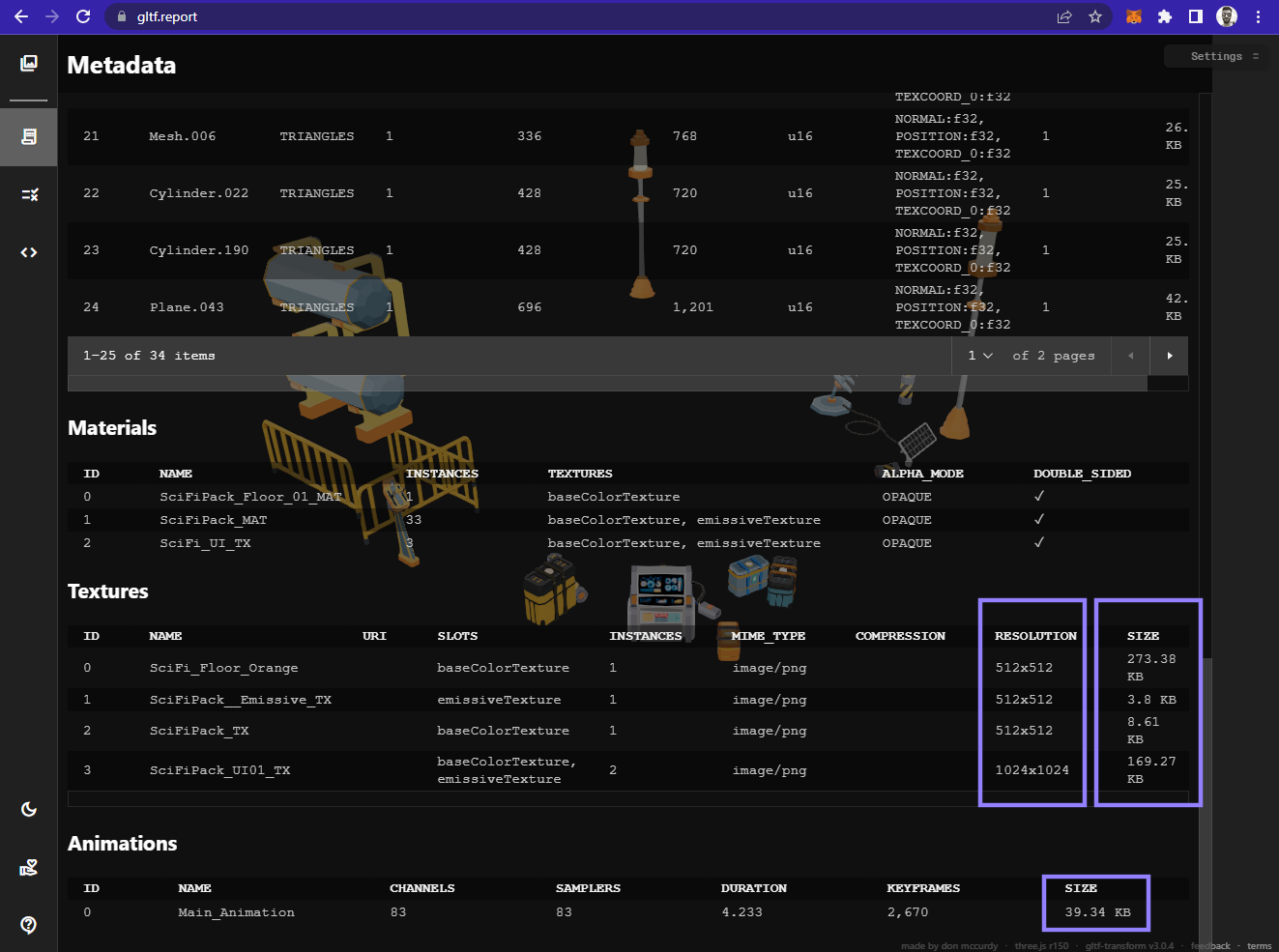 Another helpful tool is gltf.report/ . Simply drag and drop your models onto the website to view the contents of the glTF package and assess which parts of the model can be optimized.