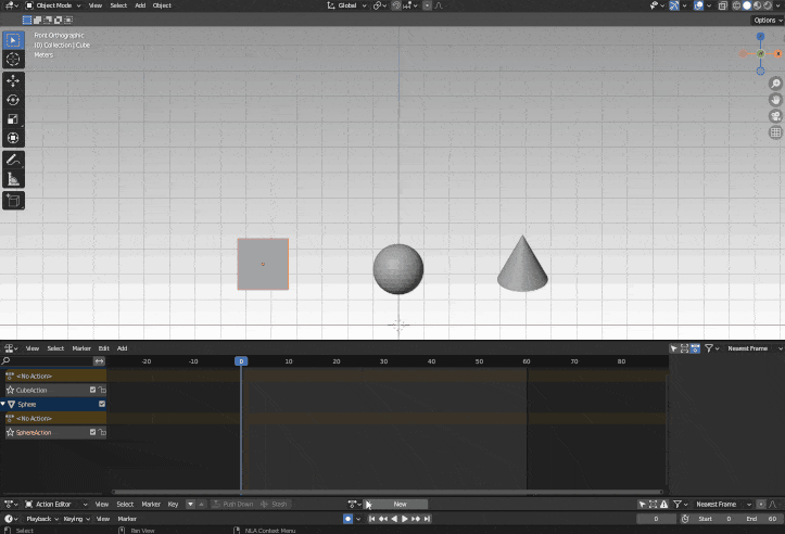 • Make sure you have the Dope Sheet > Action Editor tab open and click on New to add an animation clip.