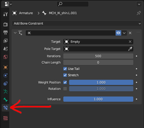 For the Target, select Armature. Once you do that, an option called Bone will appear under Target. For that, select the IK bone you created. In Chain Length you will set the number of bones that should be affected by the IK. Since we are doing a leg, we want it to affect the shin and the thigh, so set it to 2.