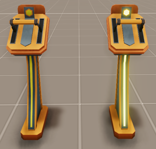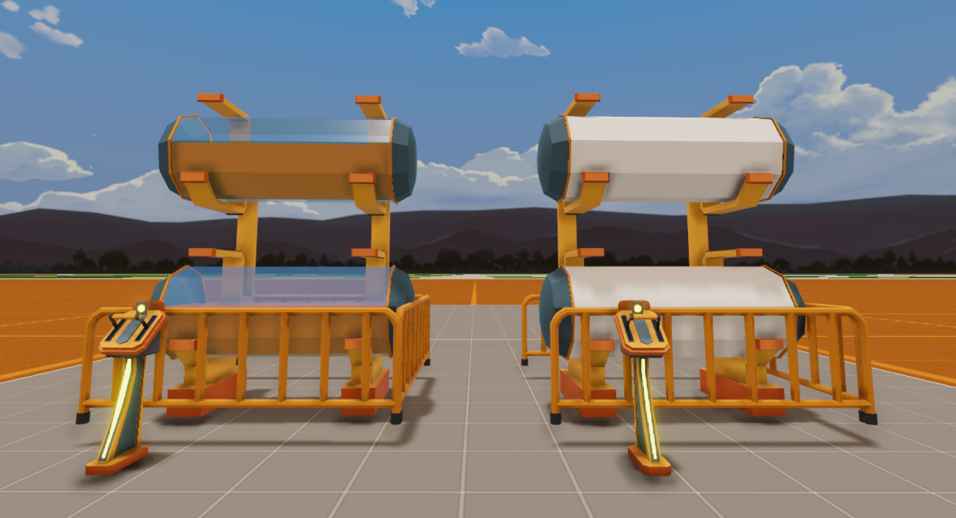 The image below shows two identical models, created with the same colors and textures. The model on the left uses all PBR materials, some of them include metalness, transparency, and emissiveness. The model on the right uses all standard materials, some including transparency and emissiveness.