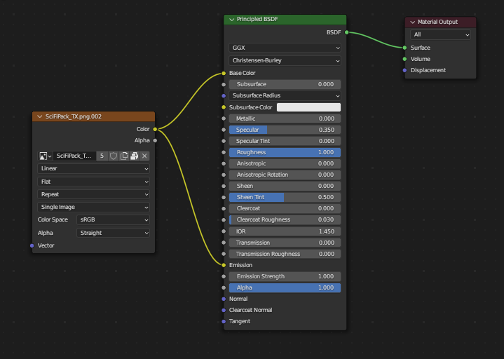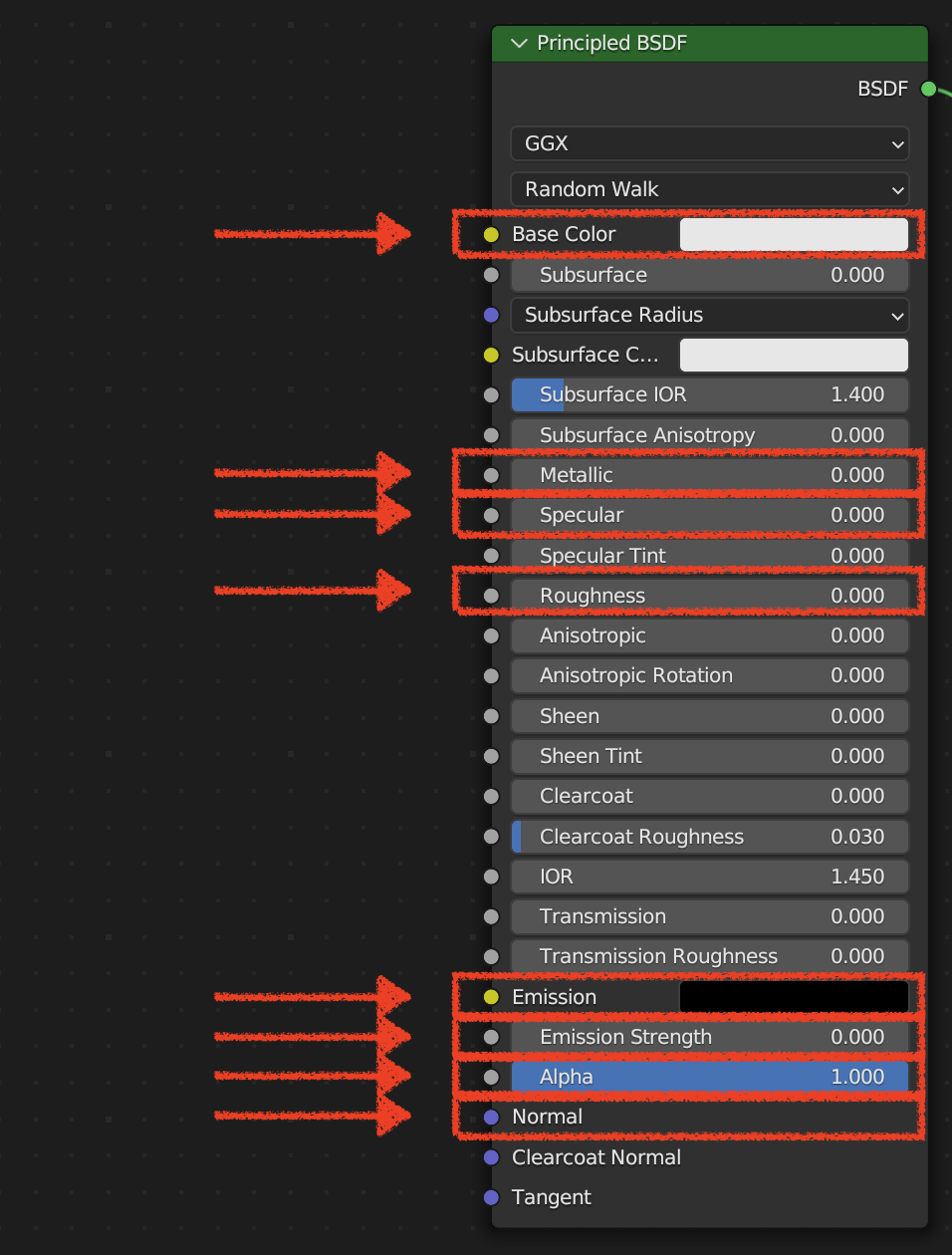 Defines the the base color of the object surface. By itself it doesn’t have any affectance by the lightning, that’s why it is combined to other nodes such as roughness, metallic, specular, etc.