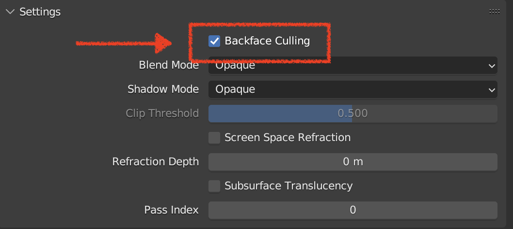 - As a rule of thumbs remember to always set backface culling in your materials. This will make your scene more perfermant giving that the engine is going to render only the visible face of your models. Only untoggle backface culling in case you need a model to be renderer in both sides (for example, a group of leafs of a tree made by 3D planes).