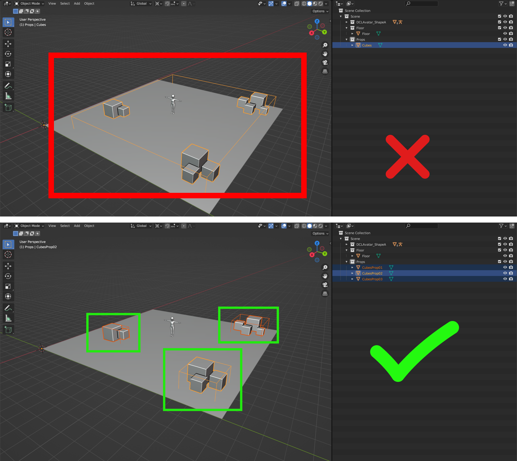 Modularity: Break down large meshes into smaller, modular parts. For example, instead of having a single mesh for an entire building, the building could be divided into separate meshes for each wall, floor, and section of the building. This allows Unity’s frustum culling to work more effectively, as only the visible parts need to be considered for rendering. It will also improve memory foot-print, because one mesh can be re-used several time for same object in different locations (to achieve this you will need to reference same mesh in your SDK7 scene definition or use instances instead of duplicated objects when exporting the scene from Blender).