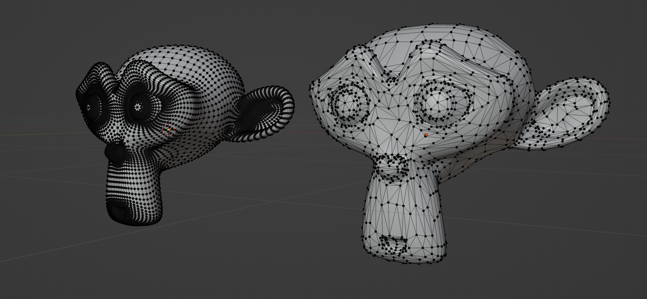 3D models have a mesh composed of triangular faces. These faces meet each other on edges (the lines along which they touch) and vertices (the points where their corners join).
