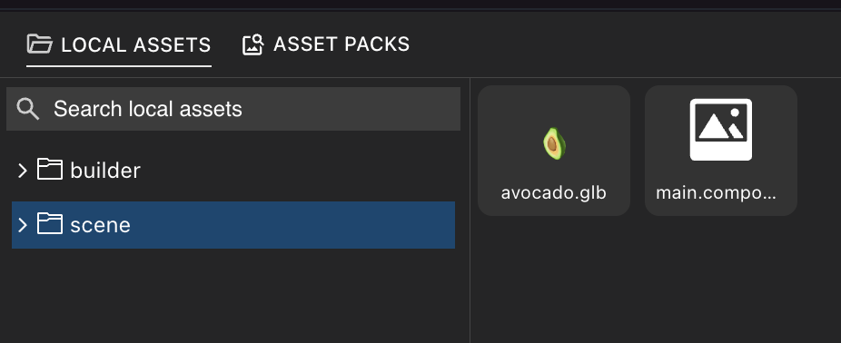 You can now find the avocado.glb model in the Local Assets tab, inside the Scene folder. Drag it onto your scene, like with any item from the Asset Packs.