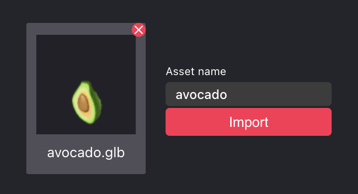2. Drag the avocado.glb file onto the region on the Scene Editor UI and click Import.