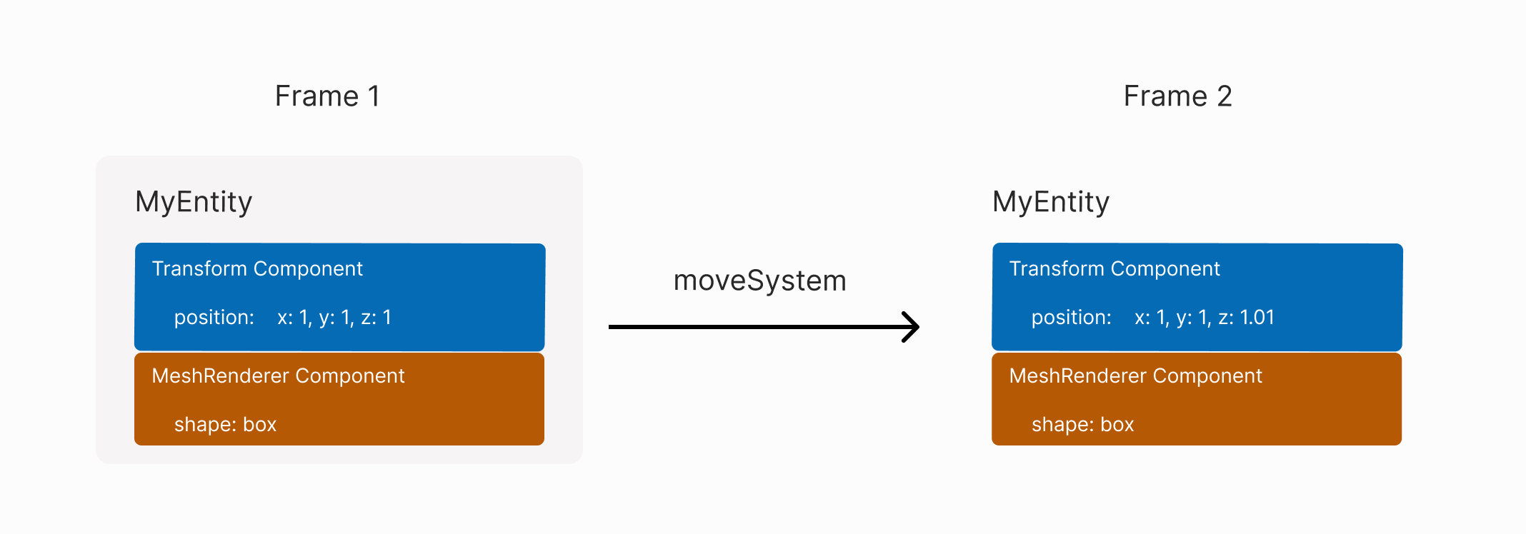 In the example above, the system MoveSystem is a function that runs on each tick of the game loop, changing position of every entity in the scene that has a Transform.