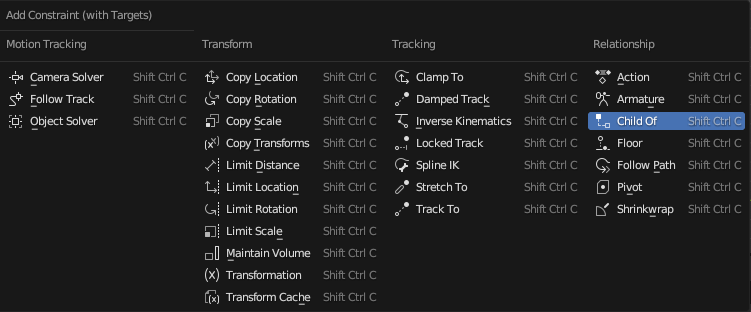 Some props might have to be attached to certain body parts, like a tennis racket to the hand. That can be done by simply adding a constraint. To do so, in Pose Mode, select the prop bone (the tennis racket one, for example), press CTRL + Shift + C on your keyborad and select Child of or just click on the Bone Constraint Properties tab and, in the drop down menu, select Child of.
