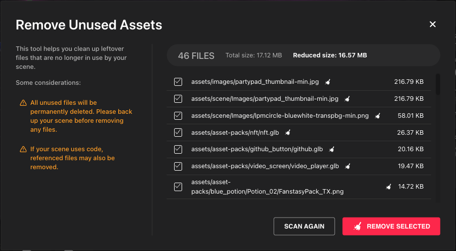 Important: If your scene contains code that references assets, some in-use assets may appear as unused. This dialog only detects assets referenced by components in the Creator Hub UI. Deleting assets is irreversible—once you click Remove Selected, the files are permanently deleted.