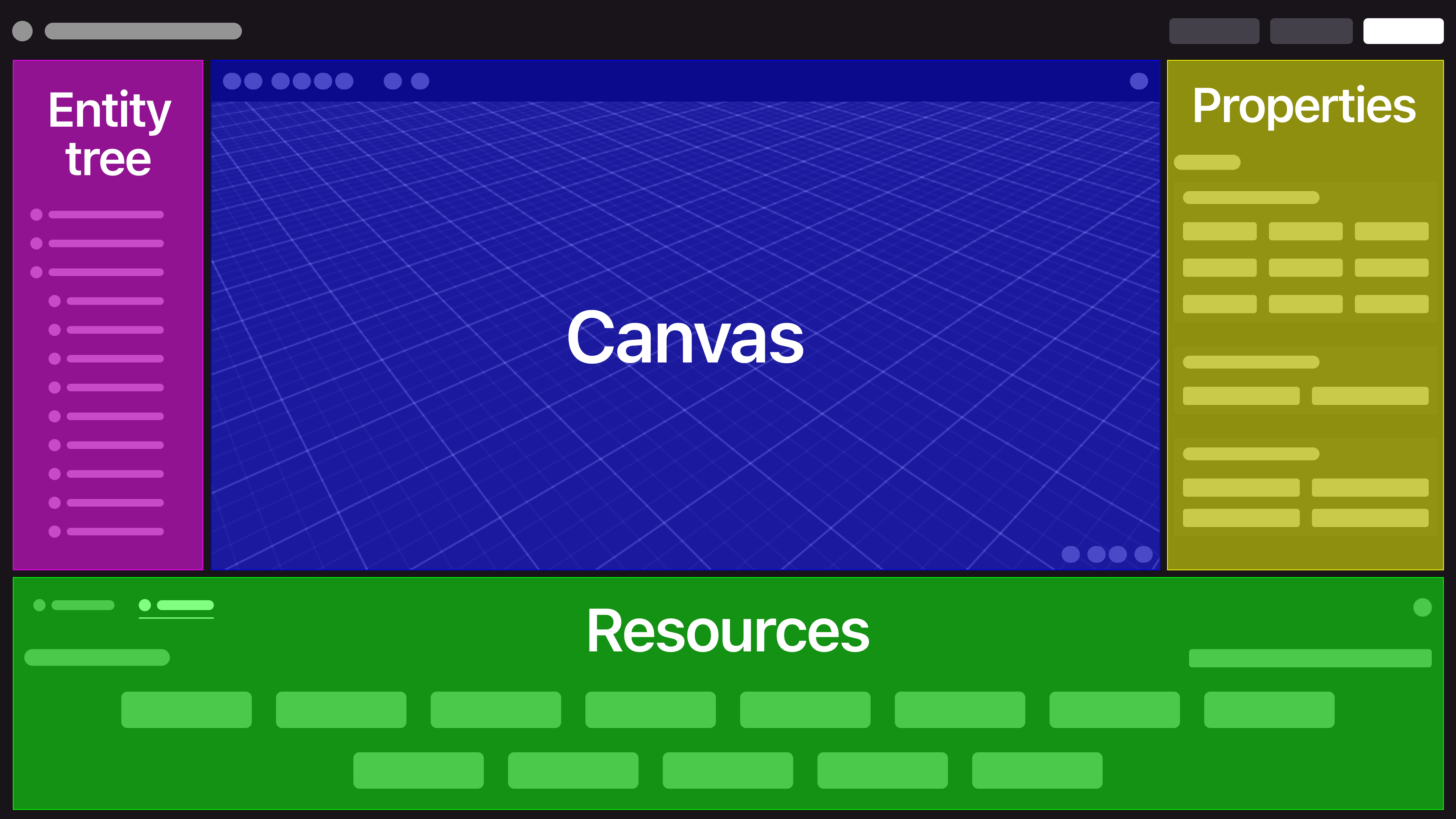 The Scene Editor’s UI is divided into a few different sections, with different purposes.