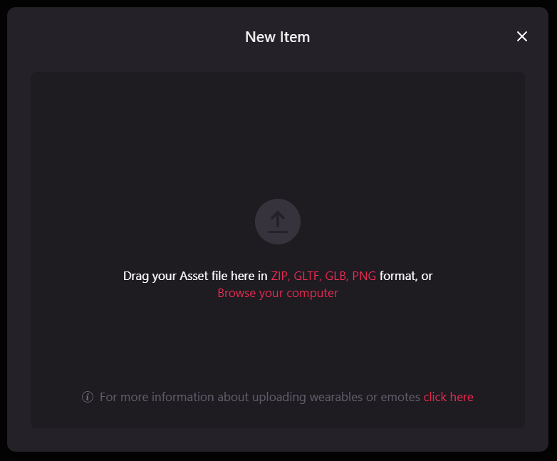 Once you click on Add Item, you will get a window like the one shown below. Just drag and drop the file with your wearable/emote or browse your computer.