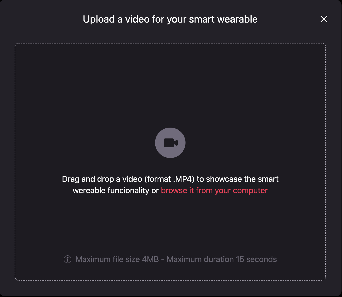 To upload your video showcase, drag and drop a .mp4 video file on the Upload a video for your Smart Wearable window or browse your computer. Remember that the video max file size is 4MB and max duration is 15 seconds.