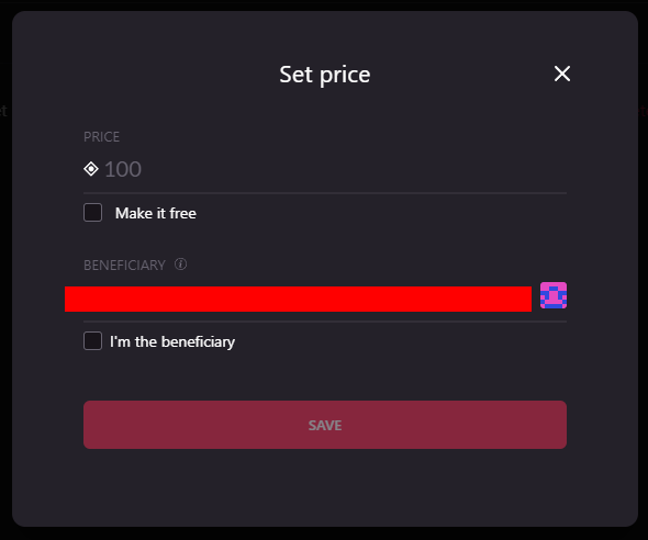 You could also Make it Free, meaning the price will be 0 MANA, and the beneficiary address will be null. Please note that offering a product for free as a primary sale does not prevent it from being sold at any price as a secondary sale.