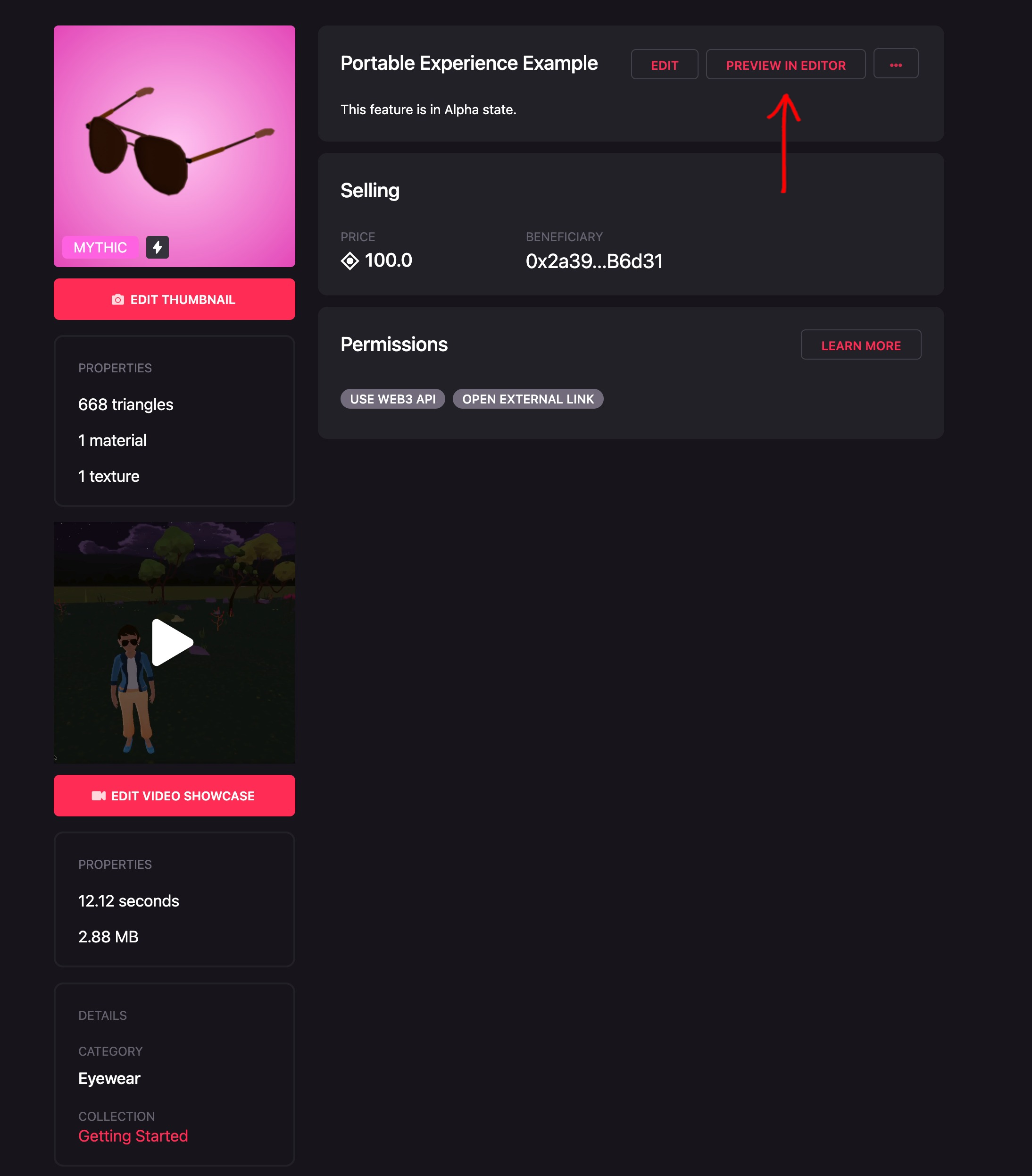 Save the price, and you will be back on the list of Wearables in your collection. When you click on the item, you will get its general info. Click on the button Preview in Editor to see it in the editor.