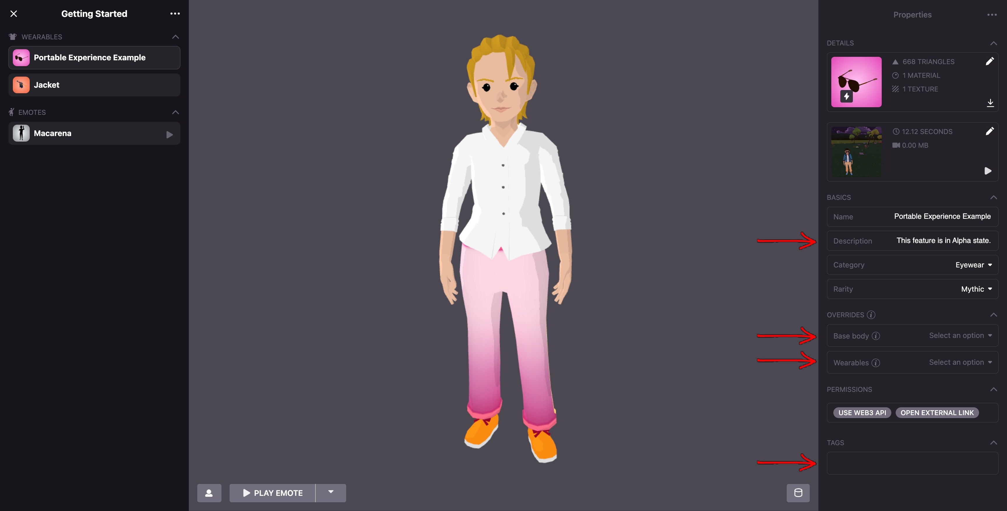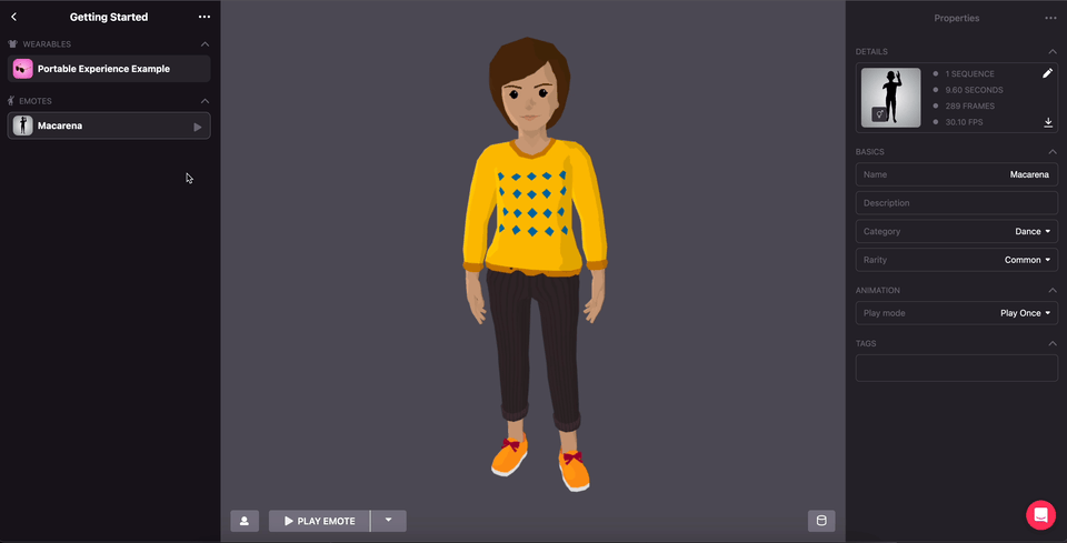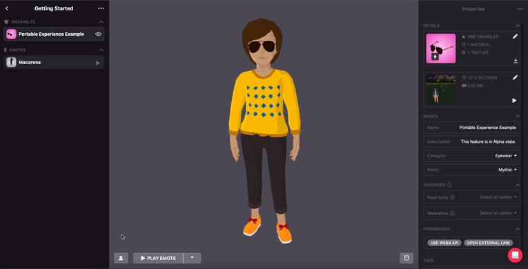 By clicking on the icon at the lower left, you can edit the avatar. This is useful if you have a male and female version of your Wearable, so check how both versions look in the editor, testing different emotes to identify skinning issues and mixing other Wearables to see how it matches with other clothes. When you’re done editing your wearable, click on Save.