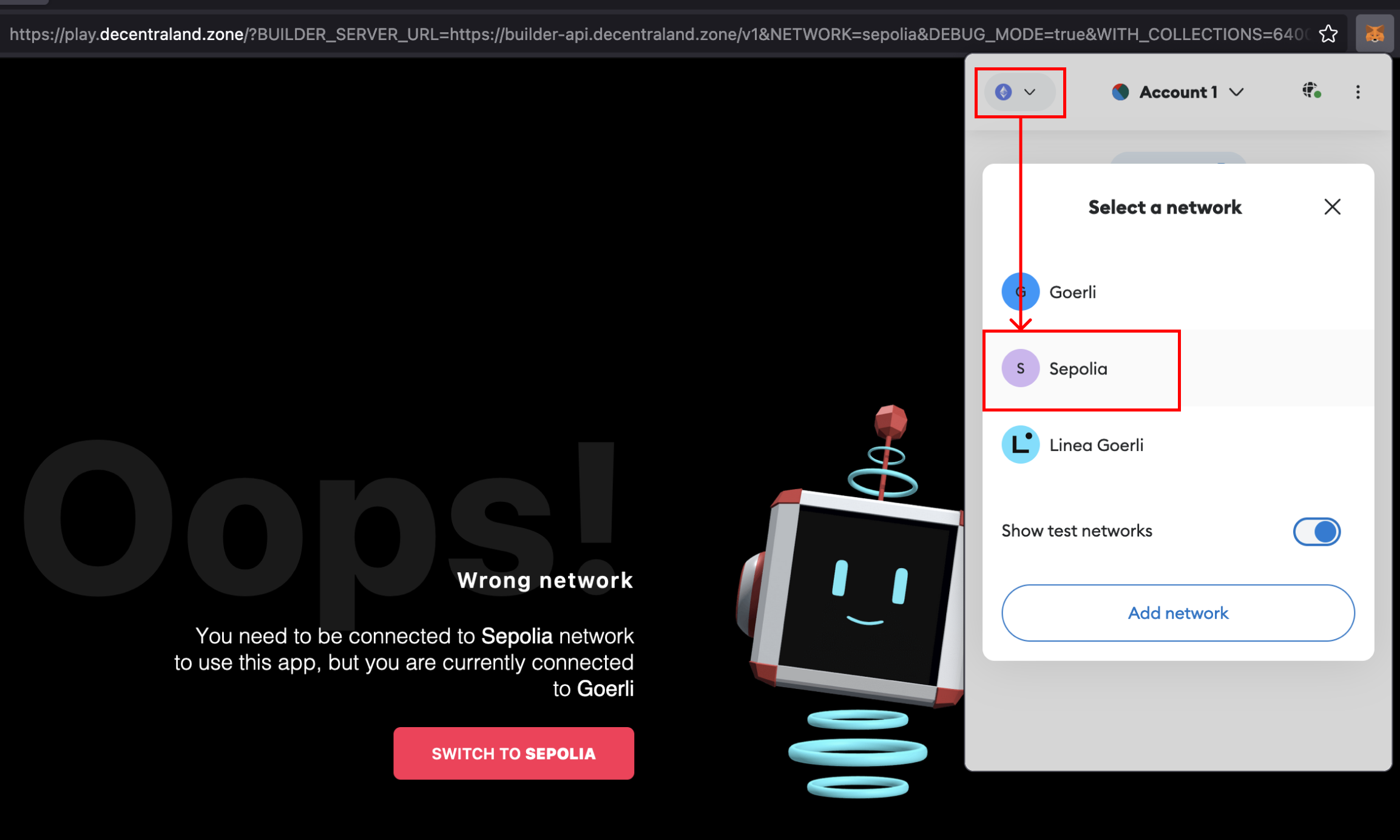 Click on Switch to Sepolia, and a pop-up from your wallet asking you to switch the network will show up. Click on Switch Network, and the new tab will automatically refresh. To test your Smart Wearable, you can go to the backpack and select it.