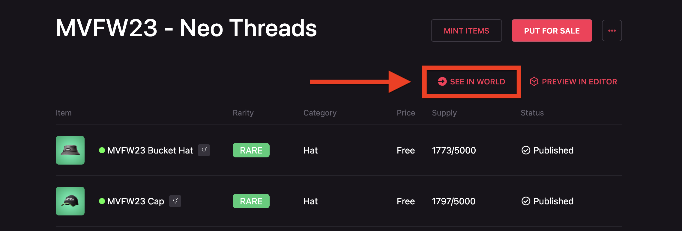 Even after testing the wearable in the editor, it’s important to check how it’s actually going to look like and behave in Decentraland. To test it in world, go to the Collections tab. Select the desired collection and click the button See in World.