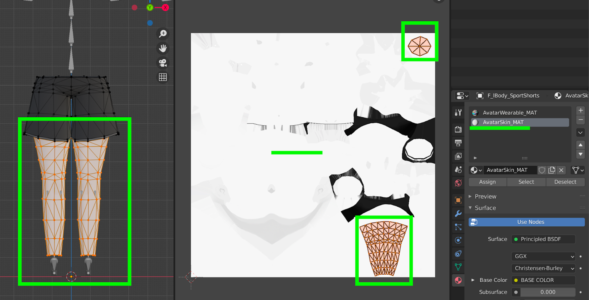 Important: always preserve the UV mapping for any body part that is exposed by a wearable, like the legs exposed by the shorts or skirts.