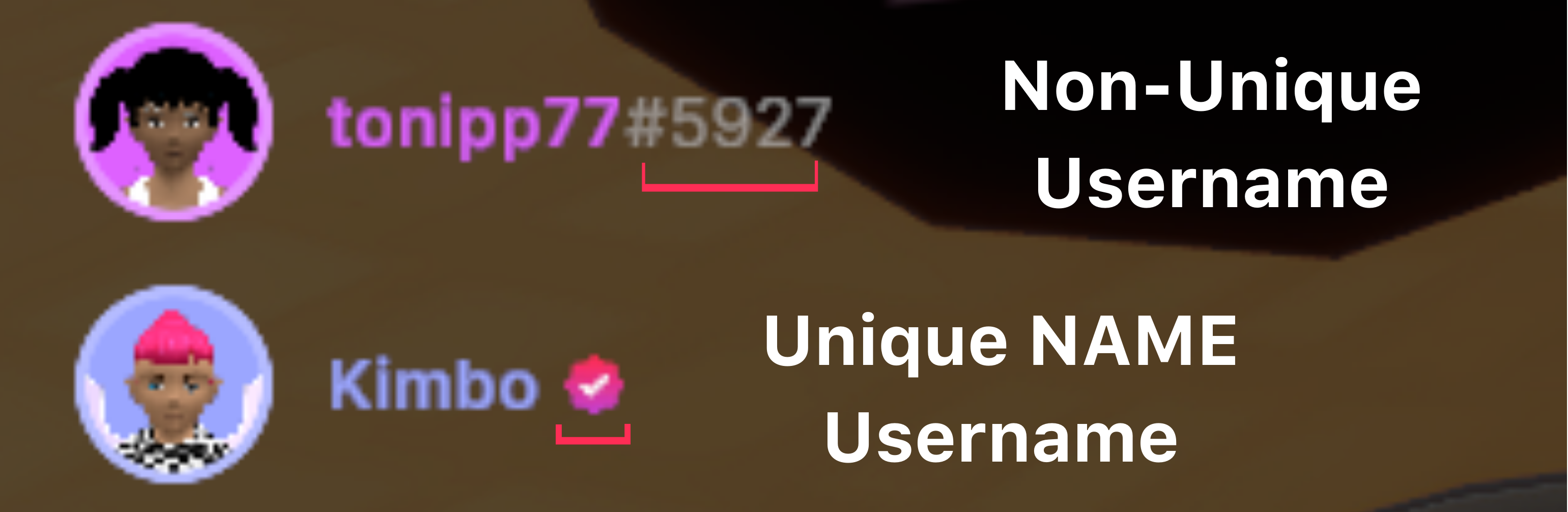 - A NAME username, one that is unique to you, comes with a bunch of extra perks, and has a verified checkmark icon following it instead of a string of numbers. Learn more about NAMEs here .