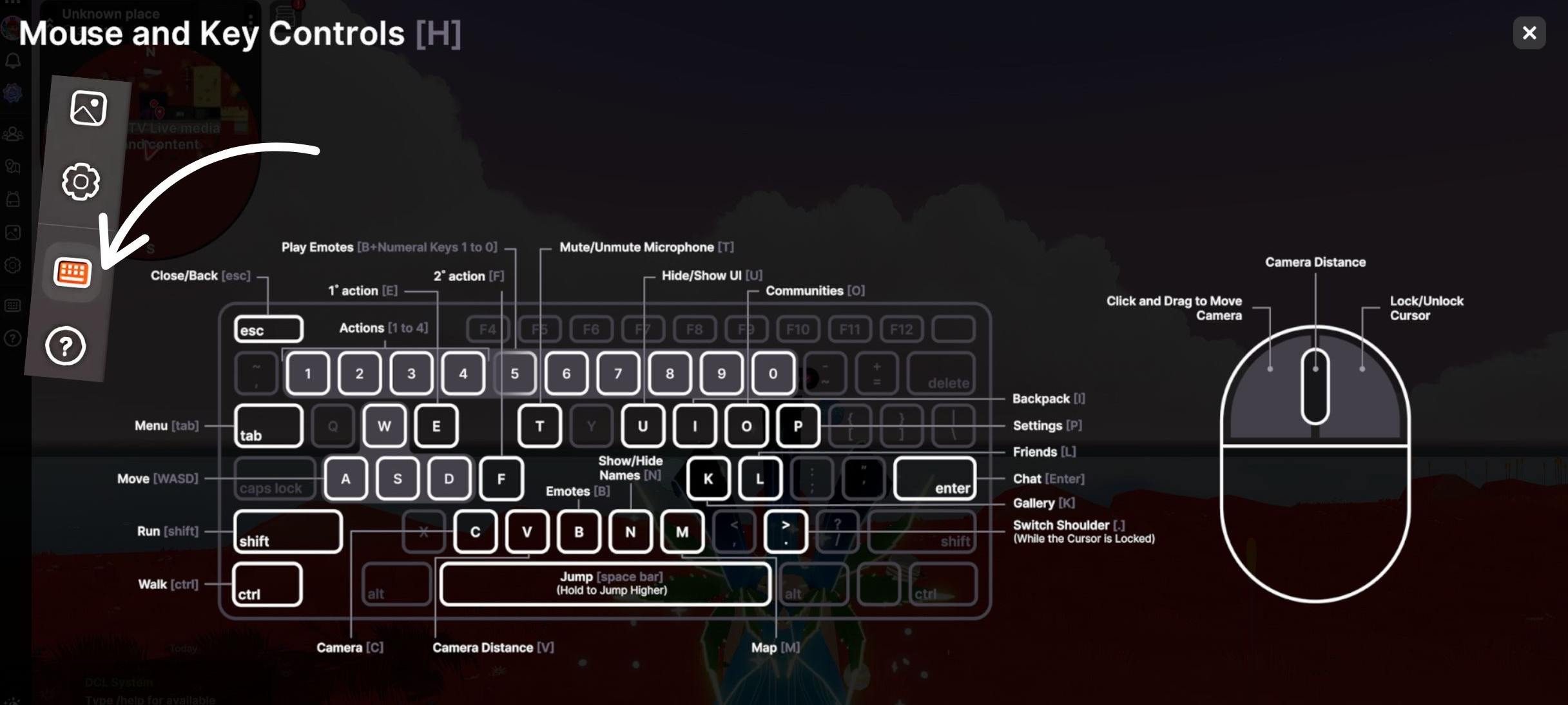 In addition to using the WASD or arrow keys to move your avatar around Decentraland, your keyboard can do a lot more for you when you’re in-world. All the keyboard shortcuts are shown above. You can pull up this graphic in-world whenever you need it, just click the keyboard icon in the sidebar menu.