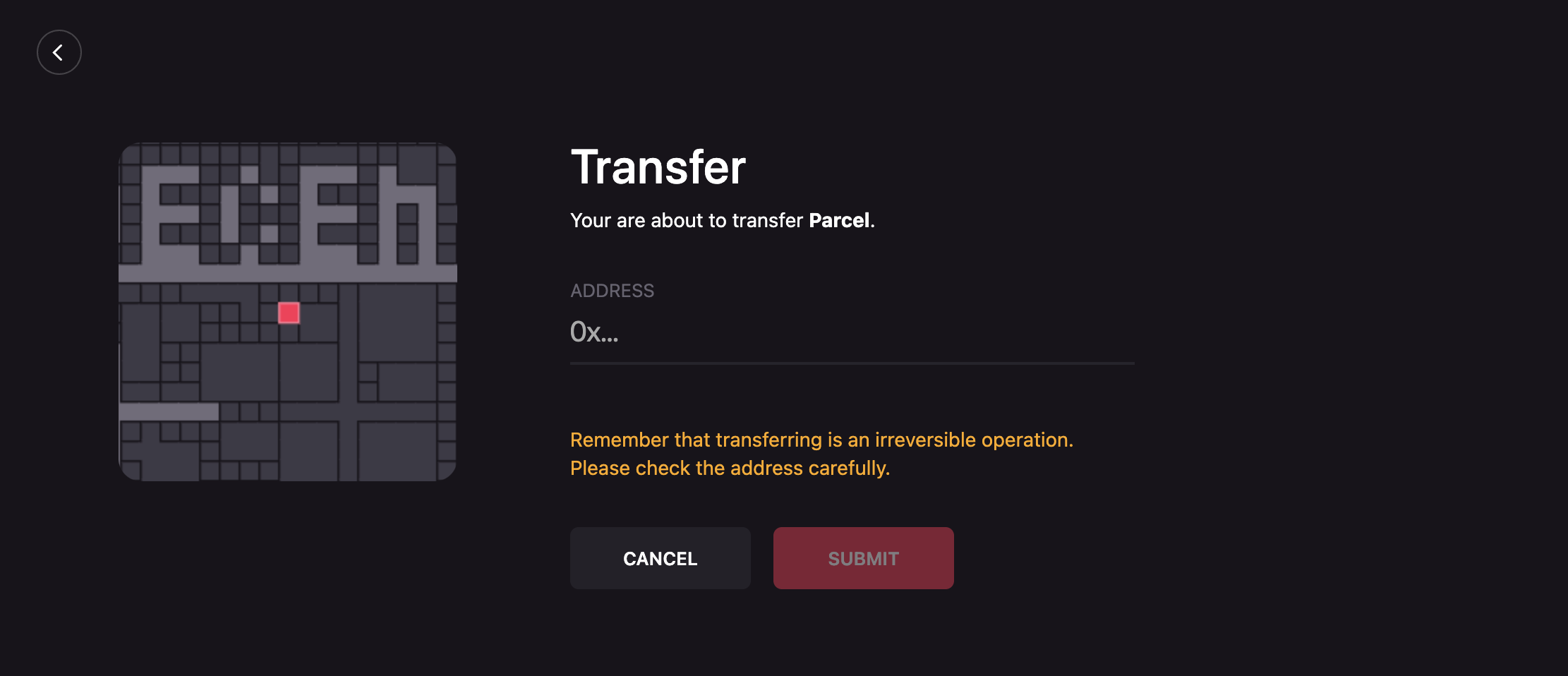 📔 Note: Please double check this address, since you cannot cancel the operation. While the recipient could always transfer the LAND back to you, the original owner cannot reverse the action.