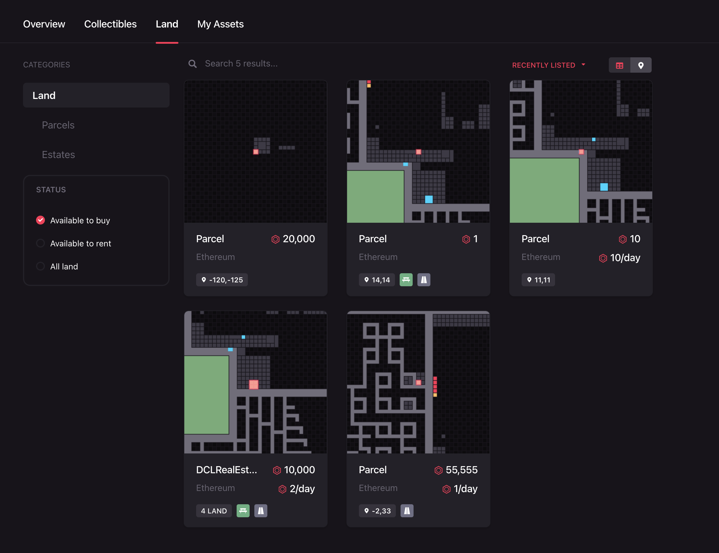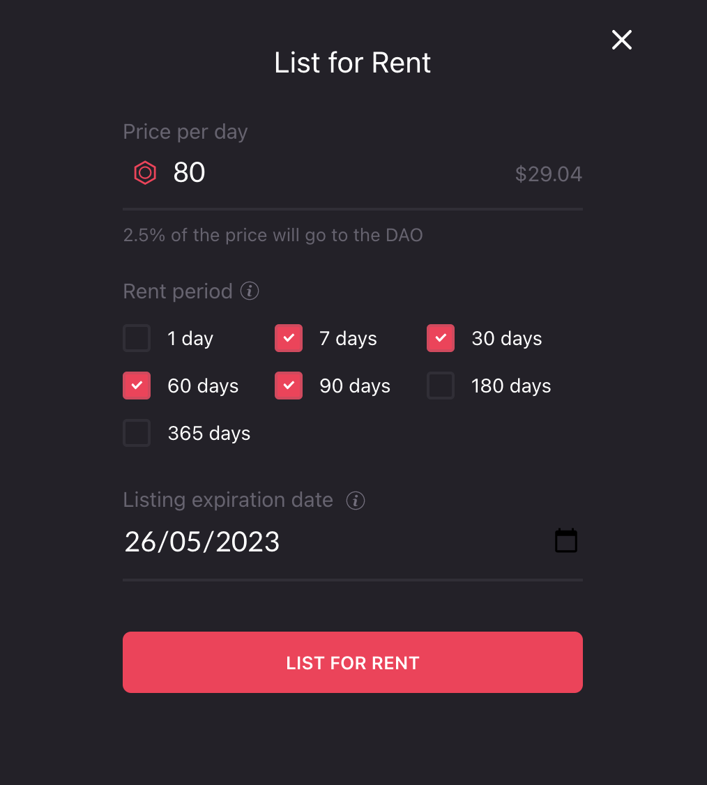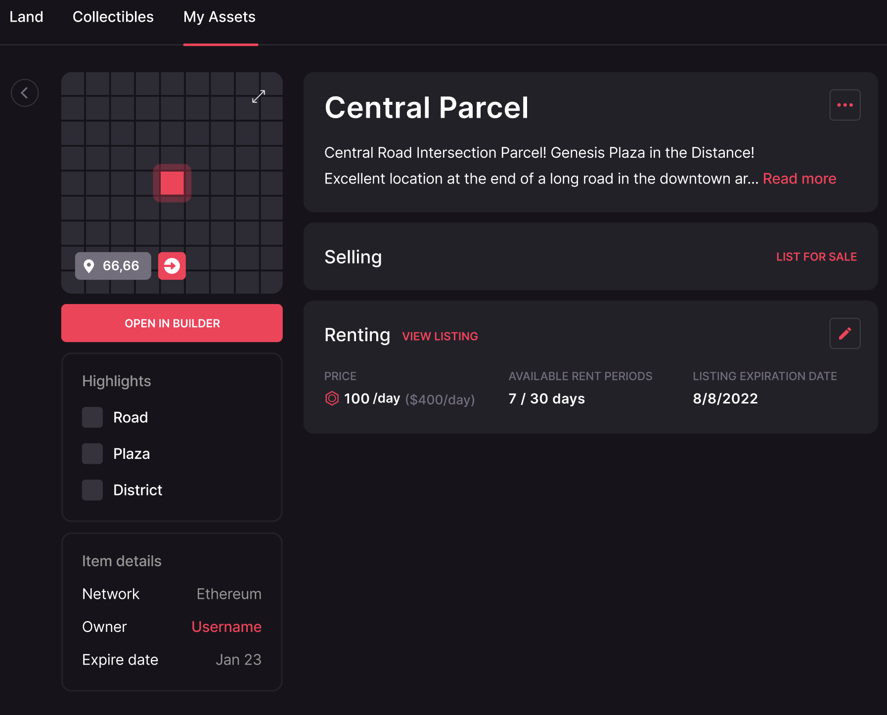 After the price, rent period and listing expiration date are set, your LAND will appear as available for rent in the Marketplace.