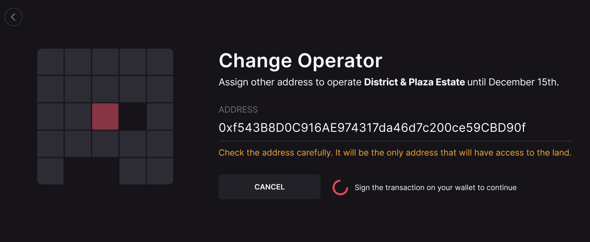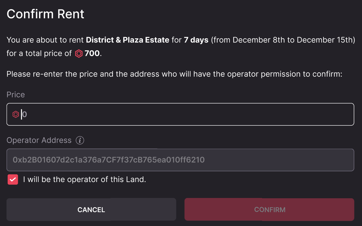 Before you confirm the Rent, you can decide who will manage the LAND (Operator Permission). It can be yourself or any other address you choose.
