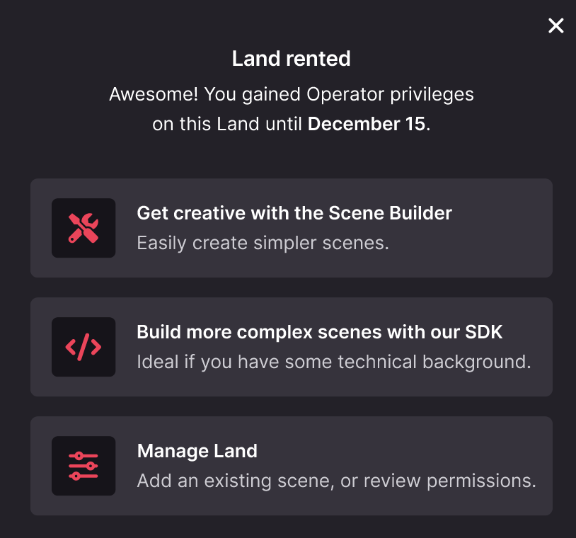 - Rented until “date” - The LAND is already rented and the Tenant has Operator Permissions until it’s claimed back or rented by another user