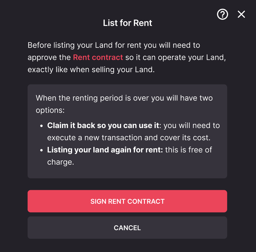 Before Listing the first Parcel or Estate for rent, LAND Owners need to allow the Rents Smart Contract to operate LAND on their behalf. This has to be done only once for Parcels and only once for Estates.