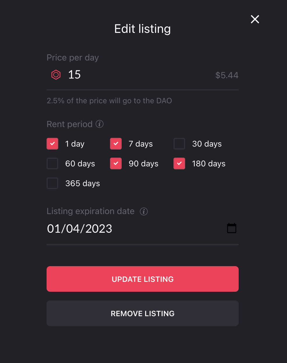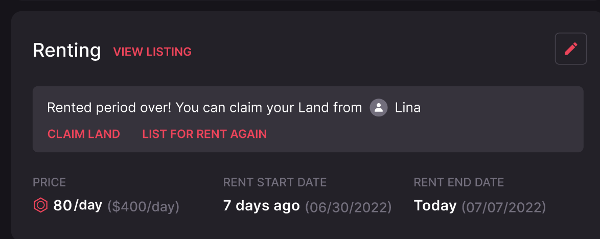After the LAND is Listed for Rent in the Marketplace, and before anybody rents it, you can edit the conditions of the Listing by clicking on the pencil icon in the LAND detail. You can also remove the Listing from the Marketplace and the blockchain.