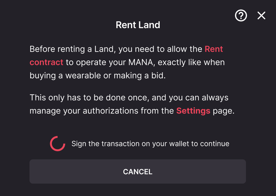 Whether it’s a Parcel or an Estate, every user that wants to Rent LAND has to send one transaction to allow the Rent Smart Contract to operate MANA on their behalf. This is needed because the Smart Contract has to pull the MANA and transfer it to the LAND Owner when the rent is activated. This is done only once for all LAND to be rented from that moment onwards.