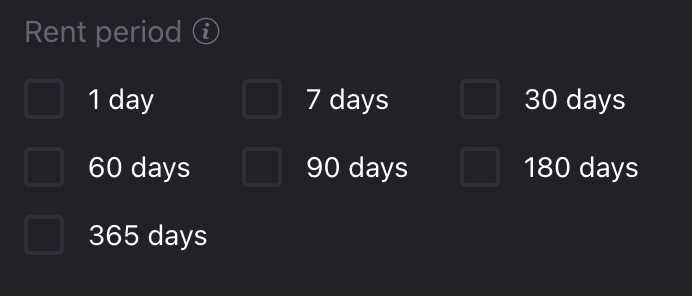After defining the Price per Day, you need to select the number of days that Users can rent your LAND. For example, if you select 7 and 30 days only, the Tenant can only choose between those 2 options. In case 30 days option is selected by the Tenant, that would be the duration of the rent from the day it is confirmed.