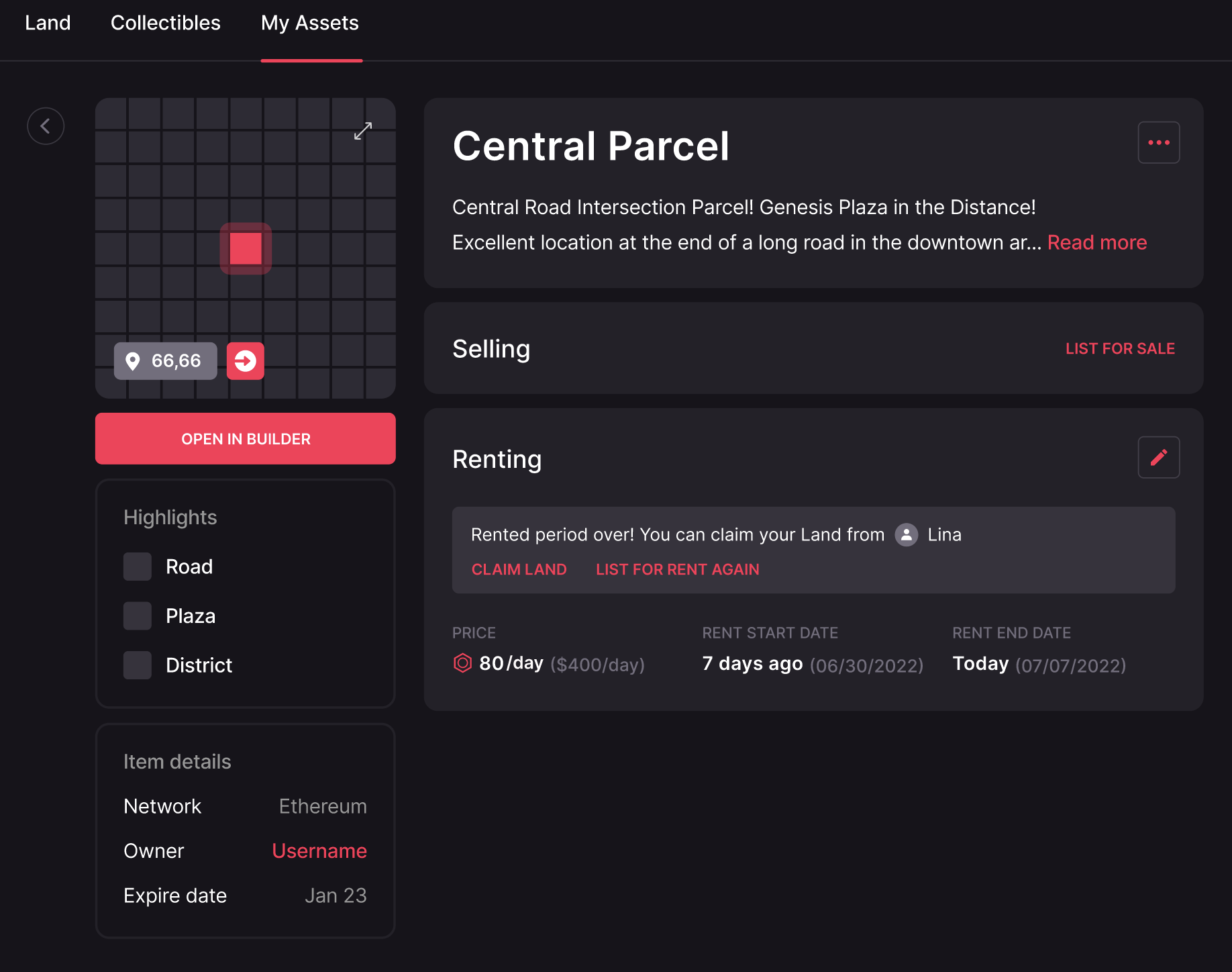 After the Rent is over, you can either Claim your LAND Back, or List it for Rent Again.