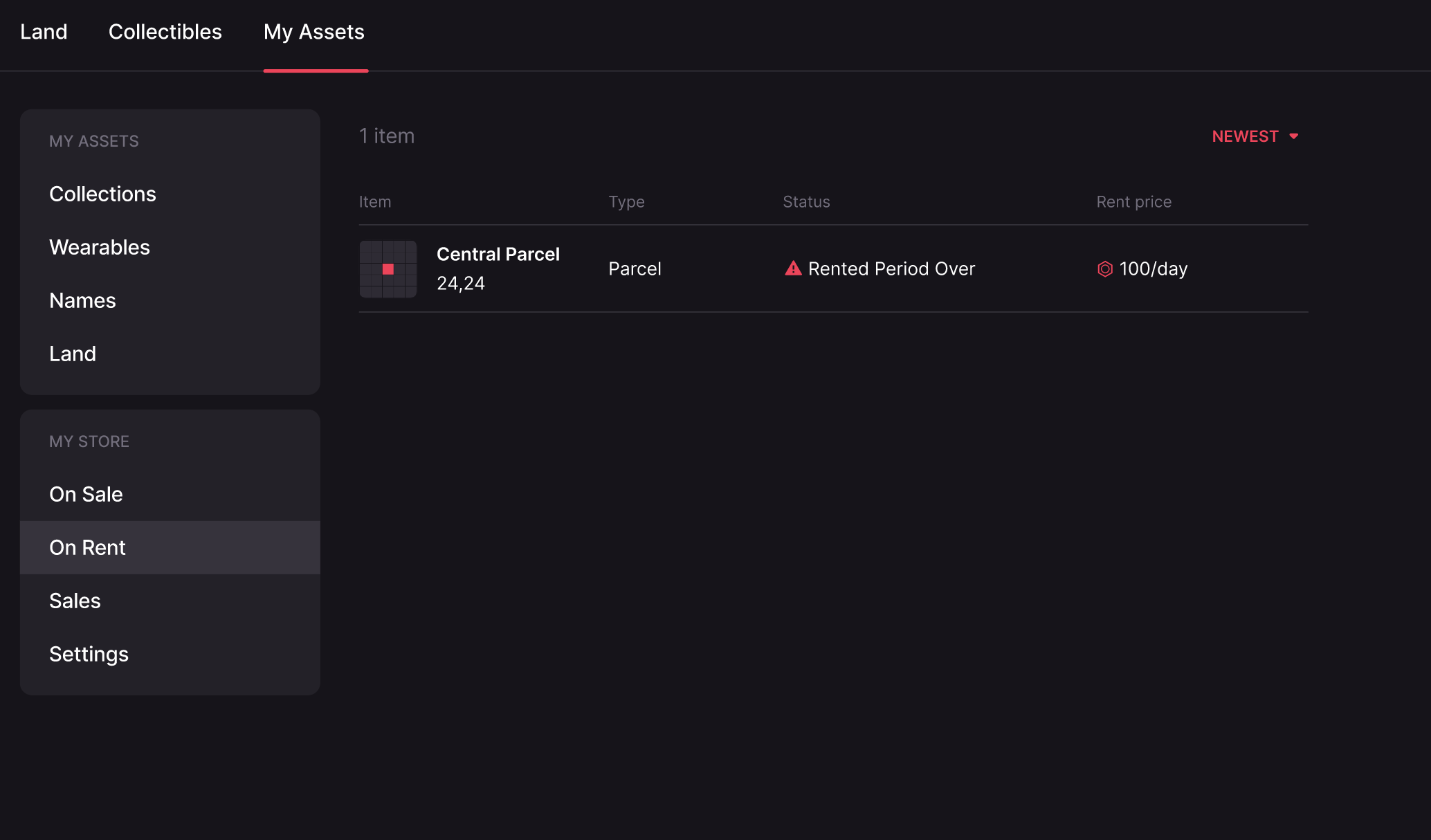 You can check the Status of any rented LAND in My Assets > Store > On Rent. The possible status are: